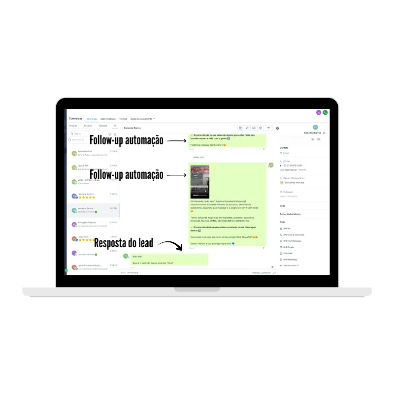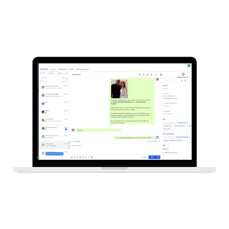 Gerencie todas as conversas em um só lugar: WhatsApp, Instagram, Facebook Messenger e E-mail. Nunca mais perca um lead importante! Todas as Conversas Centralizadas em Uma Única Tela. Responda leads do WhatsApp, Instagram e Facebook de um único painel profissional, sem perder tempo alternando entre dezenas de apps. Veja todas as interações, mensagens enviadas, agendamentos marcados e tratamentos realizados em ordem cronológica.